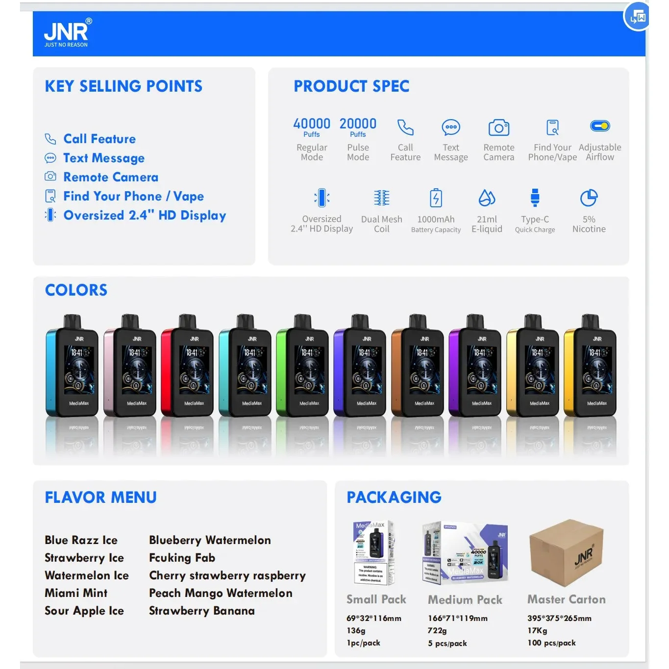 JNR Media Max 40000 Puffs predstavlja najnoviju generaciju pametnih elektronskih cigareta, dizajniranu za dugotrajnu upotrebu i napredno upravljanje.